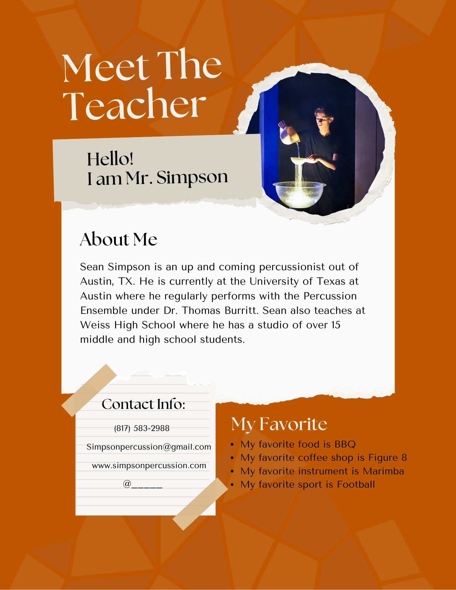 Sean teaches at Weiss High School, Cele Middle School, and Bohls Middle School where he actively teaches marching band and private lessons. Check out his contact information below!